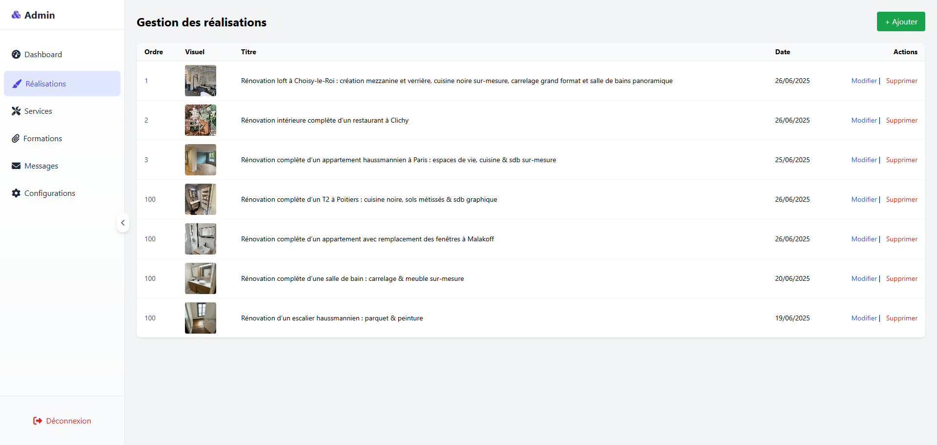 Depuis le back-office, l’administrateur peut ajouter, modifier ou supprimer une réalisation en quelques clics, sans toucher au code.