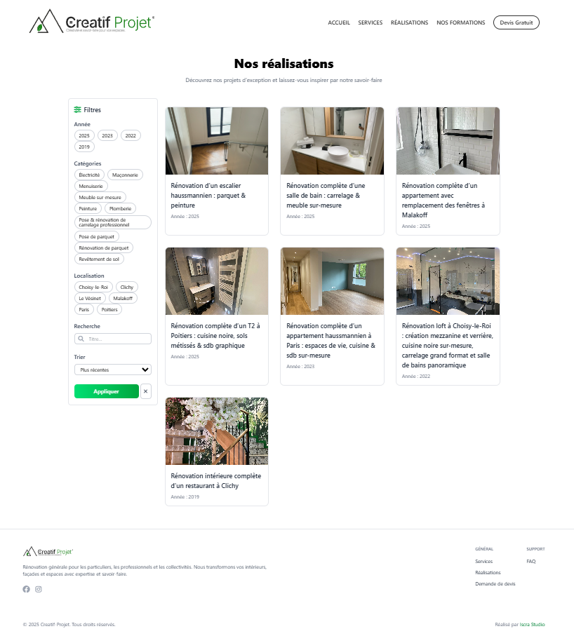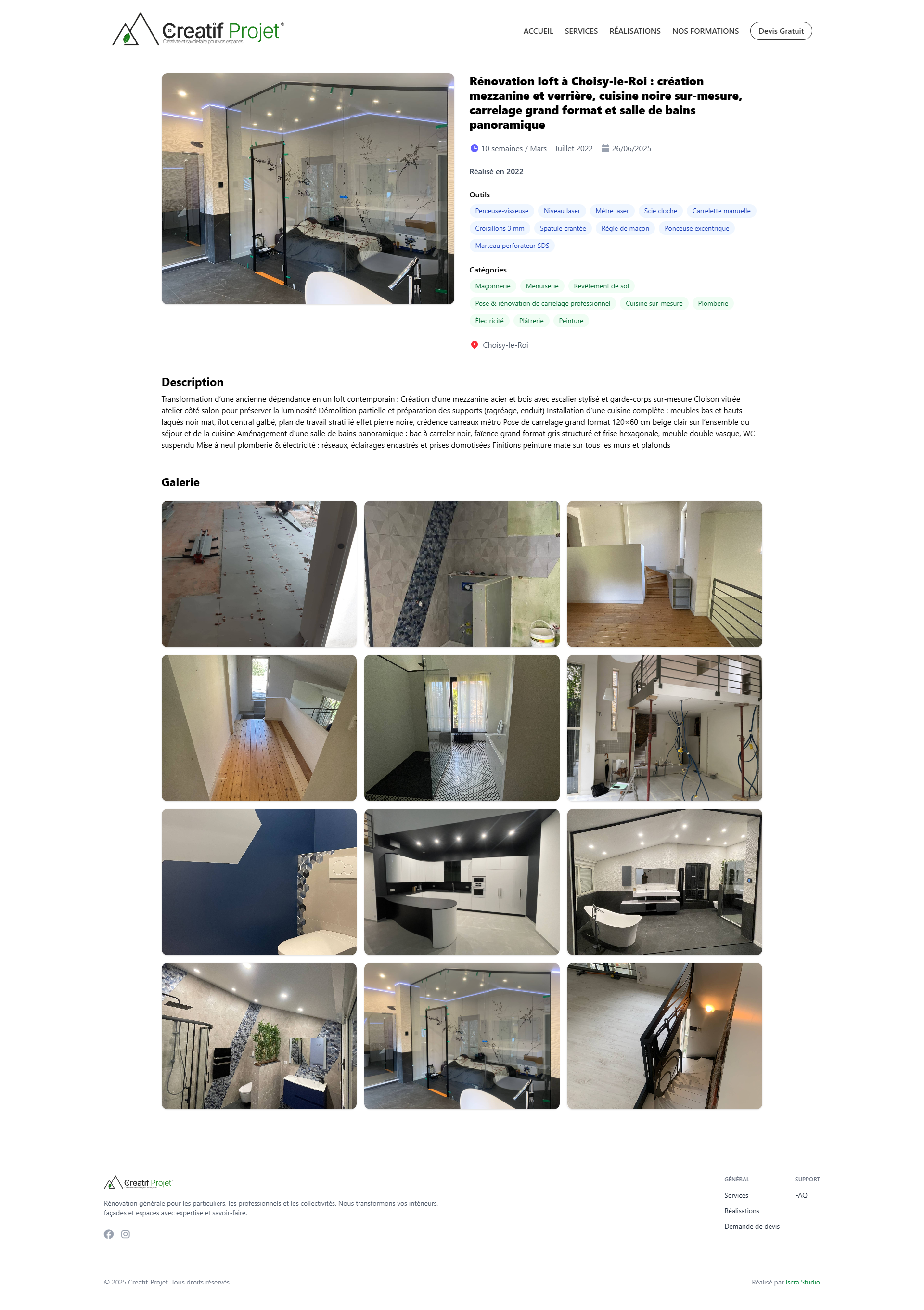 J’ai développé le site creatif-projet.fr, une plateforme moderne destinée à une entreprise de rénovation qui souhaitait une présence en ligne crédible, claire et efficace. Le site met l’accent sur la présentation des réalisations, des services et des formations, tout en restant très simple à administrer au quotidien.
