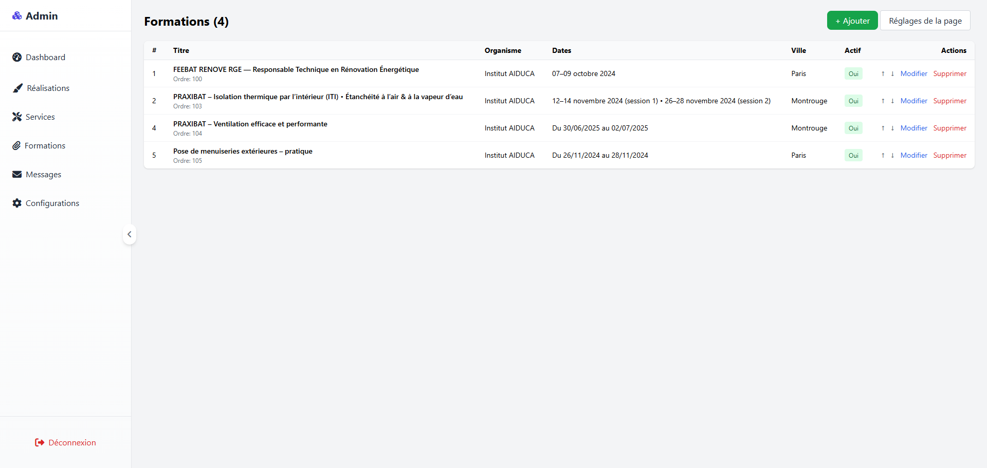 Une section Formations est également disponible, permettant de présenter des modules pédagogiques (techniques de rénovation, carrelage, plomberie, etc.). Chaque formation peut être mise à jour facilement : titre, contenu, objectifs, informations pratiques.